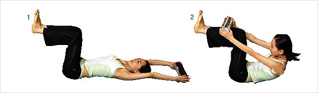 2. 배에 힘을 주고 호흡을 내쉬며 책이 무릎에 닿을 때까지 상체를 올렸다가 천천히 내리는데요. 20회씩 3세트 실시하면 좋습니다.