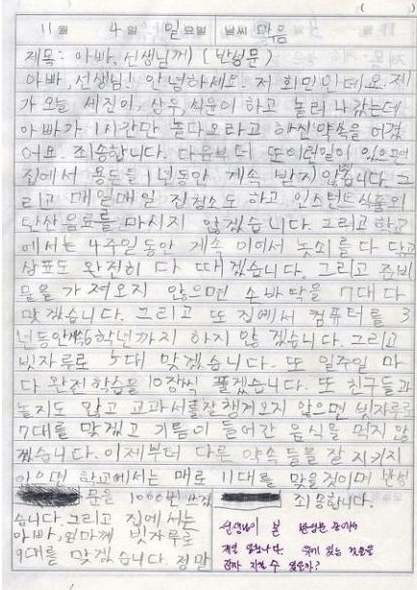 다음부터 이런 일이 있으면 용돈을 1년간 받지 않겠다는 내용을 적었다고 합니다.