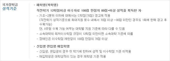 국가장학금을 받으려면 주어진 성적기준을 충족시켜야 하는데요. 재학생이나 복학생은 직전학기 12학점이상 이수자로 100점 만점의 80점 이상 성적을 획득하여야 하구요.