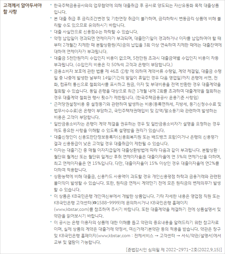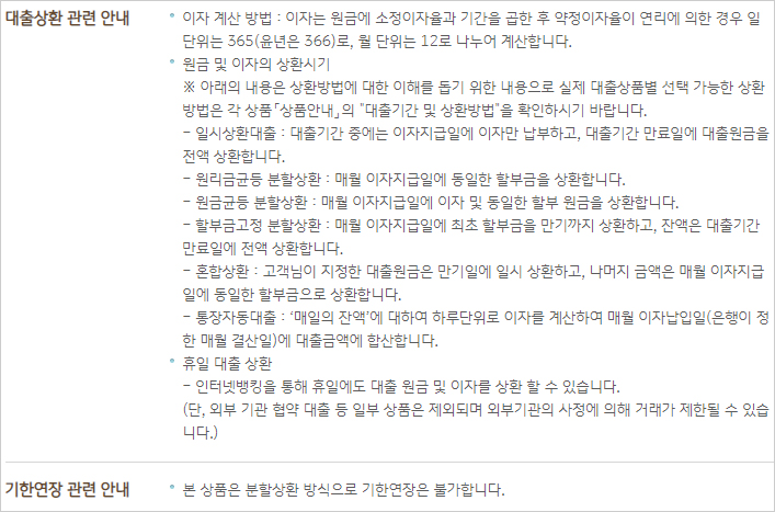 국민은행 안심전환대출 중도상환수수료는 면제인데요. 안심전환대출 대환을 위해 상환하는 기존 대출도 중도상환수수료기 면제라고 해요. 안심전환대출 대출신청금액 취급 금액 이내 면제라고 합니다. 참고로 본 상품은 금리인하요구권 신청대상이 아니라고 해요. 또한 분할상환 방식으로 기한연장도 불가능하다고 합니다.