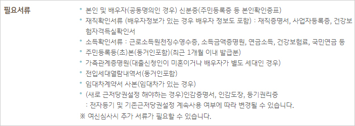 ▶ 재직확인서류 (배우자정보가 있는 경우 배우자 정보도 포함) : 재직증명서, 사업자등록증, 건강보험자격득실확인서