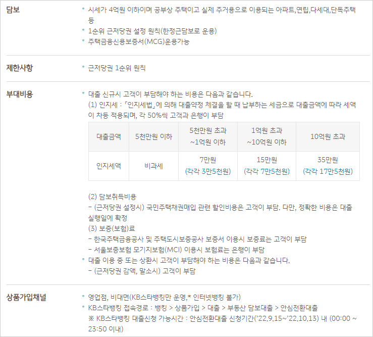 국민은행 안심전환대출 신청방법은 영업점과 비대면을 통해 가능한데요. 인터넷뱅킹 가입은 불가하며 KB스타뱅킹을 통해서 가입이 가능하다고 해요. KB스타뱅킹 접속경로는 뱅킹 > 상품가입 > 대출 > 부동산 담보대출 > 안심전환대출 순으로 신청하면 되구요. KB스타뱅킹 대출신청 가능시간은 안심전환대출 신청기간인 2022.9.15~2022.10.13 내 00:00 ~ 23:50 이내에 가능하다고 해요.