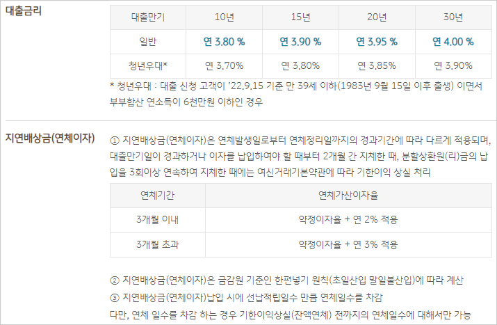 KB국민은행 안심전환대출 금리는 일반과 청년우대에 따라 다음과 같은데요. 청년우대는 2022.9.15 기준 만 39세 이하(1983년 9월 15일 이후 출생) 이면서 부부합산 연소득이 6천만원 이하인 경우에 우대 금리 혜택이 있다고 해요.
