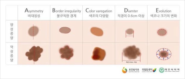 가장 악성도가 높은 악성흑색종의 경우 가려움증이나 통증 같은 피부암 초기증상의 자각 증상이 없다고 합니다. 평범한 검은 반점으로 보이기 때문이라고 합니다. 따라서 이에 대한 정확한 진단을 하기 위해서는 다음의 간단한 ABCDE관찰법이 도움이 된다고 합니다.