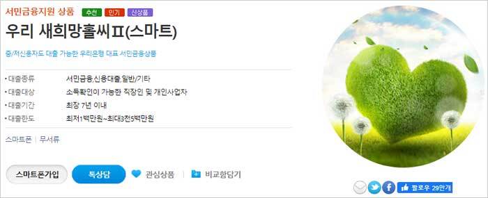 우리은행 새희망홀씨2 대출 한도 금리 자격조건 등 기타 자세한 내용은 영업점 직원 또는 우리은행 고객센터(1599-5000 또는 1588-5000)에 문의하시거나 우리은행 홈페이지 신용대출 카테고리 내 우리 새희망홀씨Ⅱ(스마트) 항목을 통해 확인 할 수 있다고 합니다.