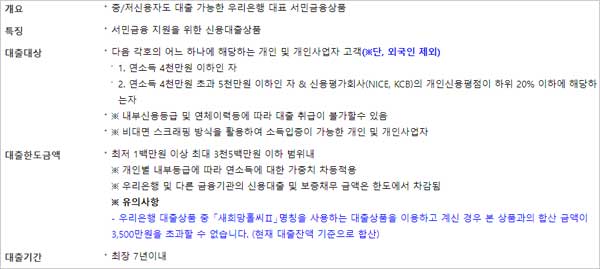 다만 우리은행 대출상품 중 새희망홀씨2 명칭을 사용하는 대출상품을 이용하고 계신 경우 본 상품과의 합산 금액이 3,500만원을 초과할 수 없다고 합니다.