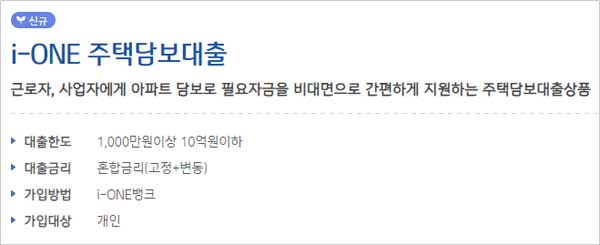 기업은행 주택담보대출 아파트대출 금리 이자, 한도 금액, 신청 대상 자격 조건, 서류, 담보, 중도상환수수료, 기간, 부대비용 등 보다 자세한 내용은 IBK고객센터 1588-2588, 1566-2566 또는 기업은행 각 영업점, IBK기업은행 홈페이지→ 금융상품 → 개인상품물 → 개인담보대출 카테고리 내 i-ONE 주택담보대출 항목을 통해 확인 할 수 있다고 합니다.