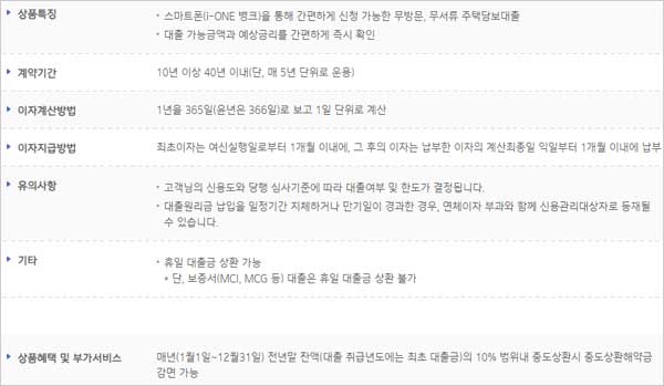 ▶ 기업은행 주택담보대출 아파트대출 상품은 스마트폰(i-ONE 뱅크)을 통해 간편하게 신청 가능한 무방문, 무서류 주택담보대출이며 대출 가능금액과 예상금리를 간편하게 즉시 확인이 가능하다고 합니다. 참고로 휴일 대출금 상환이 가능하지만 보증서(MCI, MCG 등) 대출은 휴일 대출금 상환이 불가능하다고 합니다.