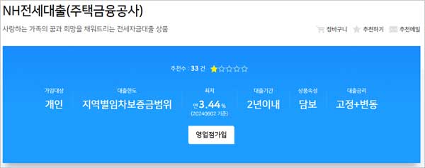 농협은행 주택금융공사 임차보증금 전세보증금 대출 NH전세대출 상품은 농협은행 홈페이지에서 소개하고 있으며 임차주택 입주시 전세보증금이 부족한 고객을 대상으로 한국주택금융공사의 보증서를 담보로 최대 임차보증금의 80%까지 대출을 지원하는 상품이라고 합니다.