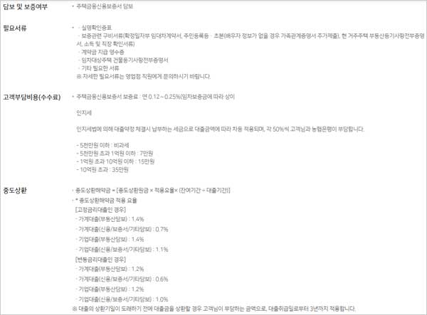 농협은행 임차보증금 전세보증금 NH전세대출 주택금융공사 한도 금액, 금리 이자, 신청 대상 자격 조건, 서류, 중도상환수수료, 상환방법, 담보, 대출 유의사항 등 보다 자세한 내용은 상품설명서를 참조하거나 고객행복센터(1661-3000, 1522-3000) 또는 각 영업점, 농협은행 홈페이지 주택/전세대출 카테고리 내 NH전세대출(주택금융공사) 항목을 통해 확인할 수 있다고 합니다.