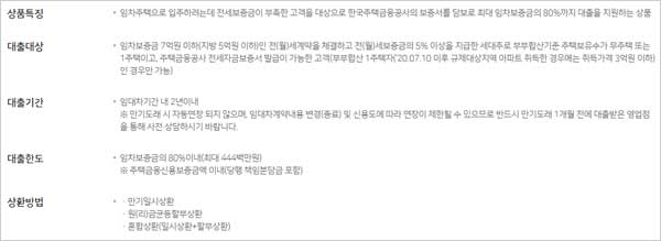 임차보증금 7억원 이하(지방 5억원 이하)인 전(월)세계약을 체결하고 전(월)세보증금의 5% 이상을 지급한 세대주로 부부합산기준 주택보유수가 무주택 또는 1주택이고, 주택금융공사 전세자금보증서 발급이 가능한 고객(부부합산 1주택자(‘20.07.10 이후 규제대상지역 아파트 취득한 경우에는 취득가격 3억원 이하)인 경우만 가능)이라고 합니다.