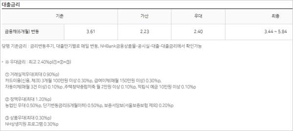 ▶ 농협은행 NH전세대출 금리 이자 이율은 다음과 같다고 합니다. 2024년 6월 2일 현재 금리이며 금리변동주기, 대출만기별로 매일 변동되며 자세한 금리는 NHBank금융상품몰-공시실-대출-대출금리에서 확인이 가능하다고 합니다.