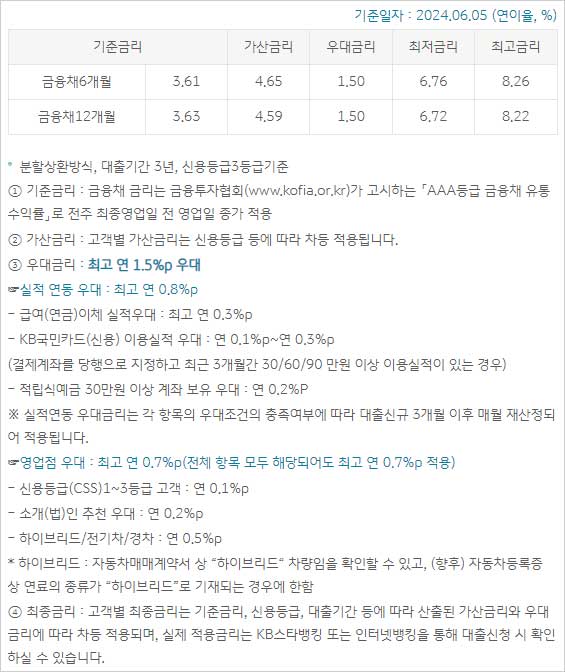 ▶ 국민은행 중고차대출 KB매직카대출 금리 이자 이율은 다음과 같다고 합니다. 2024년 6월 5일 현재 분할상환방식, 대출기간 3년, 신용등급 3등급 기준에 대한 금리라고 합니다.