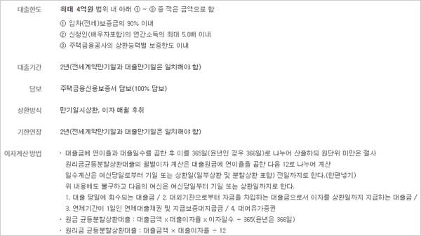 ▶ 대출 기간은 2년(전세계약만기일과 대출만기일은 일치해야 함)이라고 하며 ▶ 상환방법은 만기일시상환방식이라고 합니다.