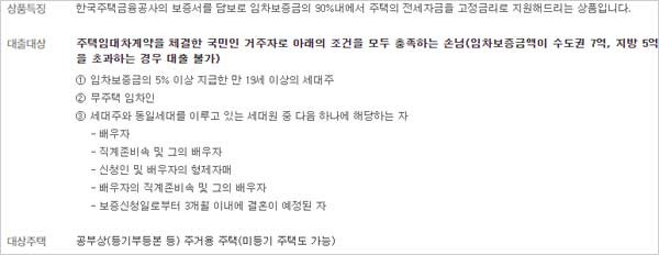 주택임대차계약을 체결한 국민인 거주자로 아래의 조건을 모두 충족하는 분(임차보증금액이 수도권 7억, 지방 5억을 초과하는 경우 대출 불가)이 신청대상 자격조건이 된다고 합니다.